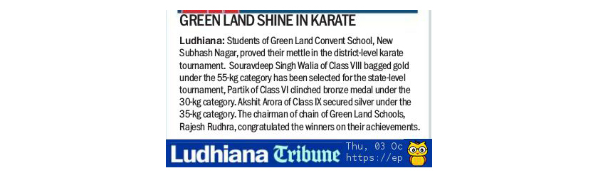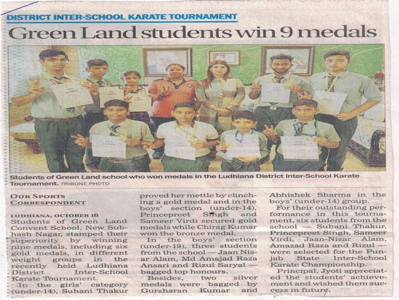 The students of our school proved their mettle in Karate District Level Tournament. It is a matter of proud to mention that Souravdeep Singh Walia, Class VIII (Category -55 kg) bagged a Gold medal and got selected for State Level Karate Tournament, Partik, Class VI (Category -30 kg) clinched a Bronze medal in U-14 category. Akshit Arora, Class IX (Category -35 kg) sealed a silver medal in U-17 category. The Students were in high spirits after securing their place and position in the tournament though it was a cut throat competition. Our illustrious Chairman, Chain of Green Land Schools, Dr. Rajesh Rudhra congratulated the winners on their achievements and inspired them to keep on performing with the same zeal and enthusiasm. He highlighted the fact that the school continues its legacy of producing State and National level players in sports arena. Elated with the achievement of the students, Dr. Jyoti Sachdev Pujara congratulated the winners for their achievement and blessed them on their success while inspiring them to keep on performing with the same zeal and enthusiasm. She also stressed on the importance of Games and Sports in the development of a child. Over-all, everyone was in a rejoiced mood.