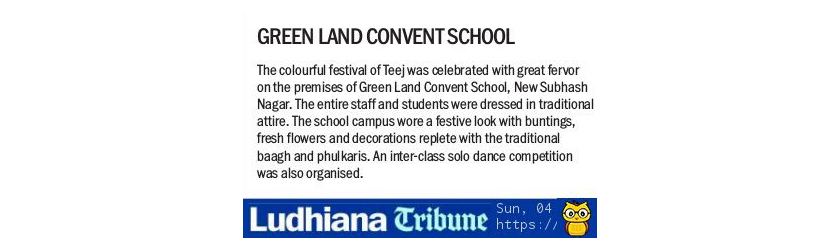 Green Land Convent School New Subhash Nagar, Ludhiana Session: 2024-25 Pre. Nursery to XII Circular No.: 116 Dear Parents1. The school timings w. e. f. 10th February 2025 (Monday) are as follows: .Pre Nursery to U KG & XI: From 8:45 a.m. to 1:00 p.m. I to IX: 8:45 a.m. to 3:00 p.m. 2. The departure timings on 11th February, 2025 (Tuesday) will be 1:00 p.m. due to shobha yatra on account of Pragat Utsav of Guru Ravidas Ji.3. The school will remain closed on 12th February 2025 (Wednesday) on account of Pragat Utsav of Guru Ravidas Ji.4. You are requested to clear the pending dues of your ward at the earliest.5. Admissions for the CBSE and Cambridge International curriculum are in process. For further details, you may contact the undersigned. Principal 08.02.2025