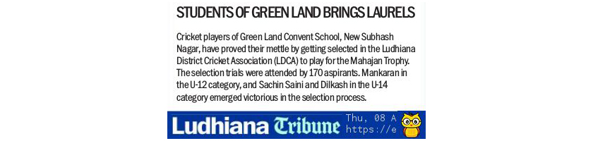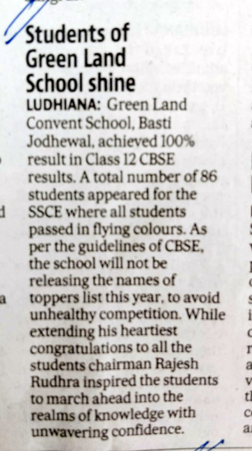 Green Land Convent School (Senior Secondary) New Subhash Nagar, Ludhiana Session: 2025-26 Circular No. 52 P. Nsy TO XII Dear Parents We are pleased to inform you that the result for Periodic Test-2 has been uploaded. You can access the results as follows: • Classes Pre-Nursery to U.K.G. & Cambridge: Please check your class WhatsApp group for the results. • Classes I to XII: Download the Result from the SchoolPad App. Principal 18.08.2025