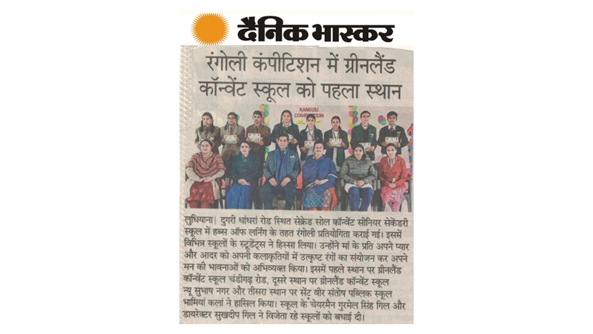 “Small touches of colors flavored with creativity and imagination mark the festal spells.” Green Land Convent School, New Subhash Nagar, Ludhiana emerged victorious in Inter School Rangoli Making Competition organized for the member schools of Hubs of Learning. The theme of the competition was based on Mother’s Love. Around 6 schools participated and rubbed their shoulders in this competition from various schools of Ludhiana. The young Greenknights Sania Bano (IX) and Anikate (VIII) were in euphoric mood by securing first runners up position through their stupendous and stunning performance. The Principal of the school, Dr. Jyoti Sachdev Pujara heartily congratulated the delighted winners on their accomplishments. She expressed her pleasure and contentment for the budding artists and blessed them on their success while inspiring them to keep on performing with the same zeal and enthusiasm. She also motivated them to be sincere and diligent in academics and activities to achieve success in all the spheres of life. Over-all, it was a moment of jubilation for the school.