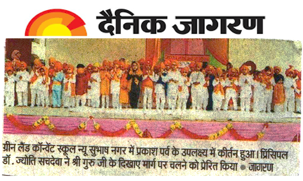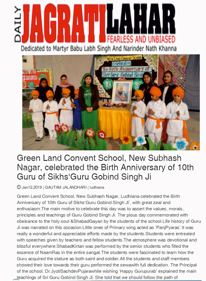 Green Land Convent School, New Subhash Nagar, Ludhiana celebrated the Parkash Utsav of Shri Guru Gobind Singh Ji with devotion and reverence. The spiritual ambience of the devotional chants was attended by all the children. The main motive to celebrate this day was to assert the values, morals, principles and teachings of Guru Gobind Singh Ji. “Blessed, blessed is the Knower of the Lord, my True Guru, He has taught me to look upon friend and foe alike.” to observe this auspicious occasion, a special morning assembly was organized to mark the Parkash Utsav of Guru Gobind Singh Ji. The students narrated His life history and contribution for humanity. On this occasion, 'Kirtan' was performed by the students of the school. They paid tribute to Guru Gobind Singh Ji by spreading his divine message of harmony, humility and equality through poems, speeches and orations. The students presented a beautiful rendition of Ek Onkar and other shabads which were appreciated by one and all present. The students along with Principal, Dr. Jyoti Sachdev Pujara paid a floral tribute to our Guru- Shri Guru Gobind Singh Ji. Speaking on the occasion, our most cherished Principal Dr. Jyoti Sachdev Pujara inspired the students to incorporate the teachings of Shri Guru Gobind Singh Ji in their life and respect their elders. She also spread the message of harmony and oneness and advised the students to pray daily to improve concentration. She said that in today’s busy life people are drifting away from many things including devotion. She told that we should follow the path of righteousness and should always be ready to sacrifice our lives for the welfare of mankind. On the whole, the premises seemed to be pristine and possessed a sense of eternity all around.