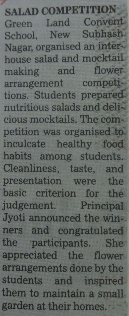 GREEN LAND CONVENT SCHOOL (Senior Secondary) NEW SUBHASH NAGAR, LUDHIANA SESSION 2025-26 Circular No. 13 III – VII “Every child is a different kind of flower, and all together, they make this world a beautiful garden.” Dear Parents We are organizing a Talent Hunt Contest for our young stars in Grades III to VII on 28th April, 2025 (Monday), in the celebration of International Dance Day. Talent Hunt is an event that provides students with a platform to showcase their talent in any field. It enables them to demonstrate their abilities and motivates them to step forward, unveil their hidden potential, unique talents and shine on stage. The contest will consist of two rounds: 1. Preliminary Round 2. Stage Round. Therefore, interested students may submit their names to their respective Class Incharges for the preliminary round latest by 24th April, 2025 (Thursday). Preliminary Round will be conducted on 25th April, 2025 (Friday). Following are the guidelines for the same: Categories: 1. Singing/ Dancing 2. Painting/ Drawing 3. Acting 4. Mime 5. Declamation/ Speech 6. Radio Jockey 7. Stand-up Comedy Competition Rules: 1. Each child can participate in a minimum of one category or maximum of two categories. 2. Performances should be suitable for the age group and must not exceed 5 minutes. 3. Participants must adhere to the suggested time limit. 4. Costumes and props are allowed and encouraged. Judgement Criteria:  Creativity and Expression  Confidence and Stage Presence  Effort and Enthusiasm  Audience Engagement Note:-The child should come prepared and dressed up from home. Principal 23.04.2025