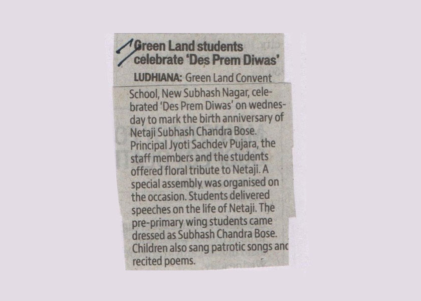 “Patriotism is your conviction that this country is superior to all others because you were born into it.” Green Land Convent School, New Subhash Nagar, Ludhiana organised an Inter Class Fancy Dress Competition on the Birth Anniversary of Neta Ji Subhash Chandra Bose to kindle the free spirit of patriotism among young Green Knights. To commemorate the sovereignty, the tiny tots of Pre-Nursery to K.G came dressed up in the attire of their favourite national Indian leaders. Whether it was as Jhansi ki Rani complete with her shining sword or as Bhagat Singh with his iconic hat, the children took great pains (aided by their parents) to complete their regalia. Not only did they come in the particular costume of their favourite leader, they even spoke a few lines about the leader. It was just not fun to be dressed up as someone else, but also some learning about very important people whom they didn't know about till date. Teachers shared a lot of information about these leaders. Speaking on the occasion, our revered Principal Dr. Jyoti Sachdev Pujara said that patriotism is very important not for the sake of the country, but for the student’s personal development as well. She articulated that Group of Green land Schools is one such unique chain which gives importance to develop respect for the country among its students. It makes full use of every opportunity to instill patriotic values along with the regular lessons. She further said that the right teaching today can safeguard the country tomorrow and that is what it is all about and motivated the students to love and keep their country above all. Indeed, it was a day of joy to experience. Certificates were presented to the winners and all participants were given story books. The programme thus came to an end with the National Anthem and jai hind slogans.