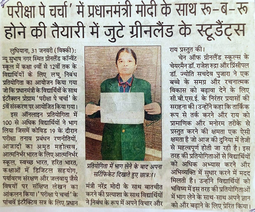 Green Land Convent School(Senior Secondary)New Subhash Nagar, Ludhiana Session: 2024-25 Circular No. 97 For Classes VI to XII Dear Teachers, Parents and Students1. The 8th edition of Pariksha Pe Charcha (PPC), an interactive program of the Hon'ble Prime Minister with students, teachers, and parents, will be held in a town hall format at Bharat Mandapam, New Delhi, in January 2025. 2. To select participants for this program, an online Multiple-Choice Question (MCQ) competition will be conducted at https://innovateindia1.mygov.in/ till 14th January 2025 for the students studying in Classes VI to XII, teachers, and parents.3. Participants will also have the opportunity to submit questions that may be addressed during the interactive session with the Hon'ble Prime Minister. Shortlisted questions may be featured in the program.4. All participants will receive a Certificate of Participation.5. It is compulsory for all students to register and complete Multiple-Choice Question (MCQ) competition and submit your details to your concerned class incharge before 14th January, 2025. Principal Dated: 26.12.2024