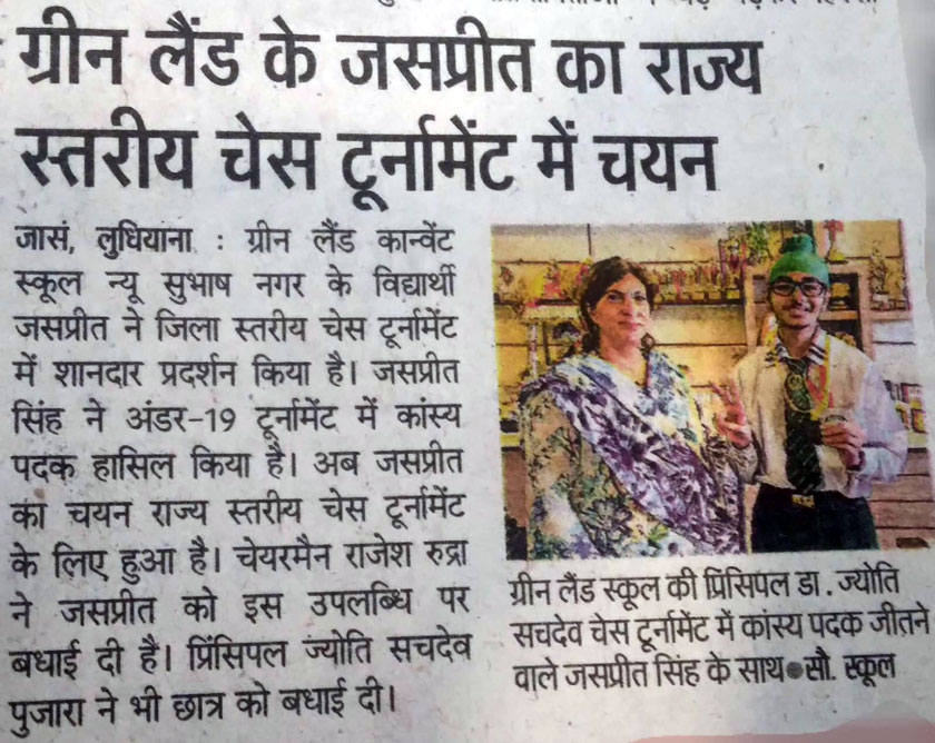 Our school excelled in the Primary School Games Cluster Level Tournament, 2019 held at Guru Nanak Public School. The chess prodigy, Amish Sharma (Class VI) brought laurels to the school by clinching Gold Medal in Chess Tournament. The revered Chairman, Chain of Green Land Schools, Dr. Rajesh Rudhra and the illustrious Principal Dr. Jyoti Sachdev Pujara congratulated him and his parents. They appreciated his courageous and spirited efforts that left no stone unturned to add another wings to the school’s glory. The inspiring Principal encouraged him to keep participating in such competitions to achieve the heights that no one ever reached. Over-all, it was a moment of great jubilation.