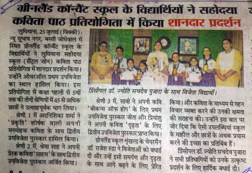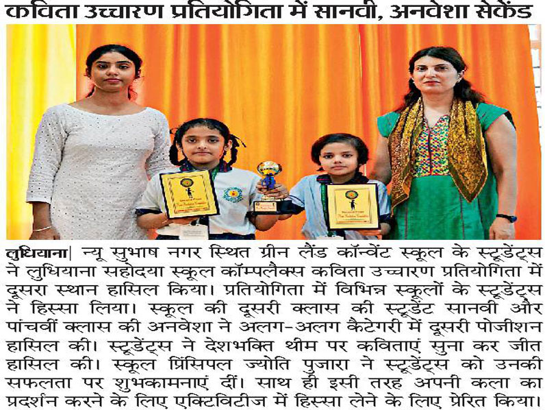 Green Land Convent School (Senior Secondary) New Subhash Nagar Ludhiana Session - 2025-26 Circular No. - 8 Class – I to V Dear Parents, We are celebrating World Earth Day through the magic of poetry! To instill love and awareness for our planet, the school is organizing an Inter Class Poetry Recitation Competition for students of Classes I to V on April 22, 2025 (Tuesday). Rules to Note: 🌍 The theme of the poem should focus on Earth, Nature, or Environment. 🌱 Poems can be recited in English or Hindi. 🌼 Original compositions are highly encouraged, though students may also choose poems by famous poets. ⏰ Each student will be given a maximum of 3 minutes to present. ✨ Judgement will be based on Expression, Relevance to the Theme, Clarity of voice, Use of Props and Overall Presentation. ✋ Interested students should submit their names to their respective Class Incharges by April 19, 2025 (Saturday). Let’s nurture young voices for a greener tomorrow! Principal 18.04.202