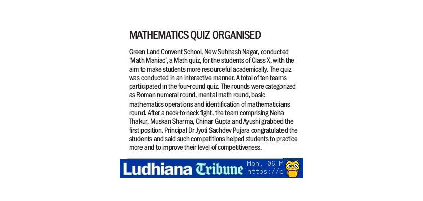 Green Land Convent School, New Subhash Nagar, Ludhiana organized virtual “BRICS Math Online Competition 2020 for the students of Class I to XII” under the aegis of CBSE-Centre of Excellence with an aim to cultivate interest in Mathematics and develop logical reasoning skills, as well to unite children from different countries. “The beauty of mathematics only shows itself to more patient followers.” Keeping it in view, the teachers gave important guidelines to the students. They guided the students to enter their correct names in their BRICS Math profile while accessing the website to receive certificates with their correct names. The competition was held online on the website www.bricsmath.com which was completely free of cost. The said test was held in two rounds-Trial Round and Main round. Trial Round gave the students an opportunity to practice & solve the tasks an unlimited number of times. In the main round, students were given 60 minutes to complete the test. The competition consisted of 10 colourful interactive mathematics tasks. The tasks on logical and spatial thinking do not require an in-depth knowledge of the school mathematics books. More than 60 students participated and performed exceptionally well in the said competition and received their certificates. Sameer Thind and Shubhit Sidhu of Class X and Sana Rana of Class VII achieved Certificate of Achievement & Certificate of Winner by scoring perfect 80 out 0f 80 in less than twenty and twenty-five minutes respectively. The esteemed Principal, Dr. Jyoti Sachdev Pujara, appreciated the continuous efforts of CBSE to promote holistic development of a child. She said that the ability to reason logically and present opinions in authentic and captivating ways is an ability that is becoming increasingly important in today’s world. In Maths, students learn that, with proper reasoning, they can arrive at outcomes that they can completely be true in a wide variety of real-life perspectives. She inspired the students to participate in such competitions in future as well to keep their knowledge up-to-date. On the whole, it was altogether a fruitful event for all. It was a great learning experience for the young learners.