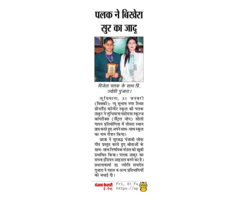 “Where words leave off, music begins.” Heinrich Heine. The spirited and outstanding young choristers of Green Land Convent School, New Subhash Nagar, Ludhiana showcased their agility and strength in an Inter School Singing Competition organised by Ved Parchar Mandal. The young lases of class IX clinched a Appreciation Award in the Group Singing Competition. Our illustrious Chairman, Chain of Green Land Schools, Dr. Rajesh Rudhra lauded the singing talent of the students and advocated that music has great power, rhythm and soul. Song and music are two separate things yet united. It inculcates human virtues and inspires to be good human beings. He congratulated and appreciated their magnificent talent. Our well-regarded Principal Dr. Jyoti Sachdev Pujara said that Music is the greatest communication in the world. Even if people don’t understand the language that you’re singing in, they still know good music when they hear it. She congratulated the winners and praised them for their wonderful performance. On the whole, the joyfulness of students had no bound after this victory.